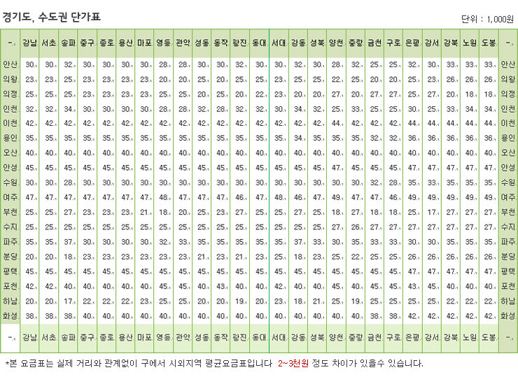 * 본 표는 물가에 따라 변동이 있을수 있으며 주기적으로 금액을 확인해주셔야 합니다.(분기당 1번 업데이트)